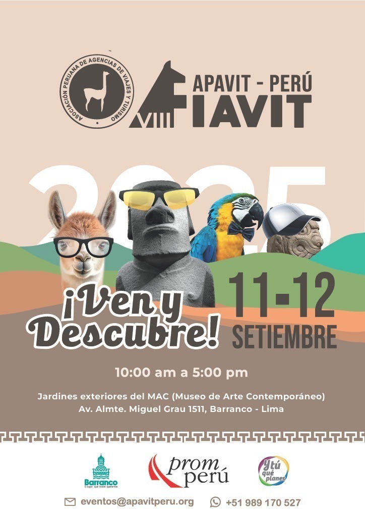 La Asociación Peruana de Agencias de Viajes y Turismo (APAVIT) inaugura hoy la VIII Feria Nacional e Internacional de Turismo – FIAVIT 2025, en una ceremonia que se llevará a cabo a las 10:00 a.m. en los Jardines Exteriores del Museo de Arte Contemporáneo (MAC), ubicado en la Av. Almte. Miguel Grau 1511, Barranco, Lima.
