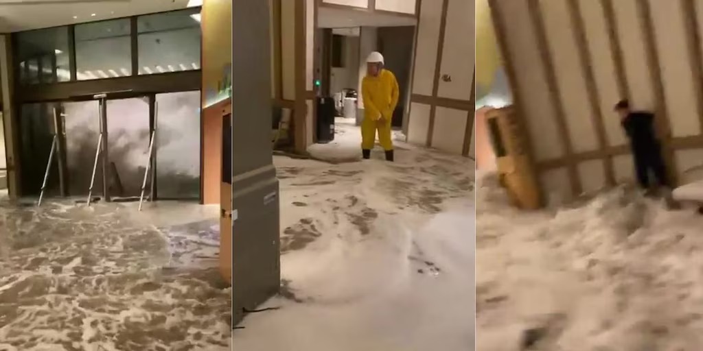 Videos que circulan en redes sociales muestran cómo el agua invade violentamente la entrada principal, sorprendiendo a trabajadores y huéspedes que fueron evacuados de inmediato. Las imágenes se viralizaron y han convertido al hotel en símbolo de la furia del Ragasa en su paso por el territorio asiático.