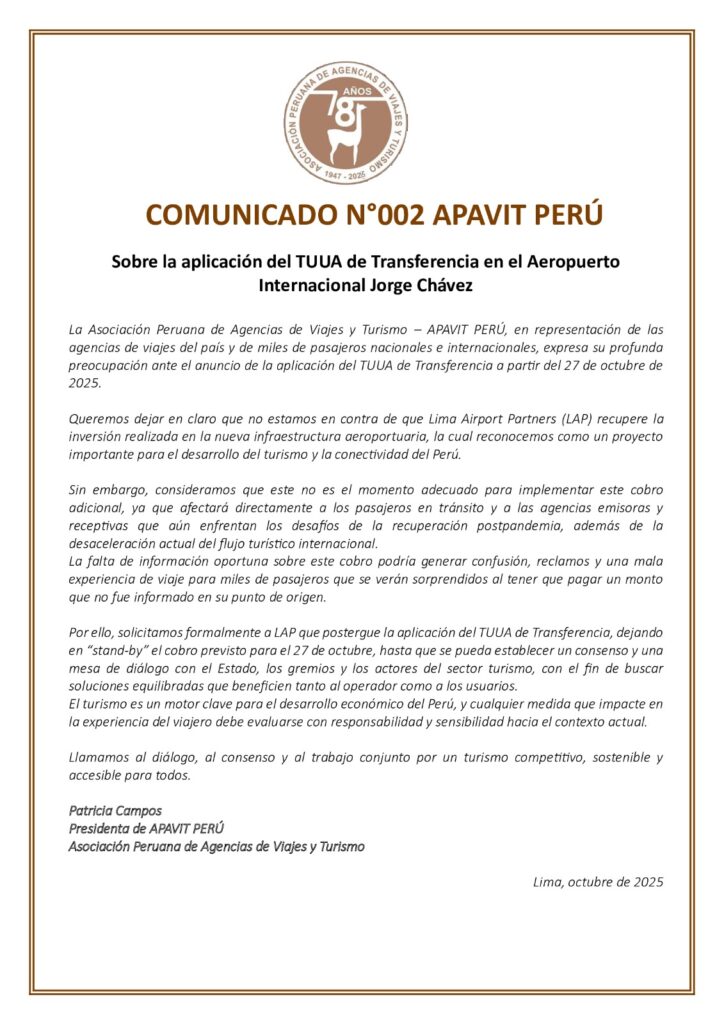 La Asociación Peruana de Agencias de Viajes y Turismo (APAVIT PERÚ) expresó su profunda preocupación ante el anuncio de la próxima aplicación de la Tarifa Unificada de Uso de Aeropuerto (TUUA) de Transferencia , programada para el 27 de octubre de 2025 en el nuevo Aeropuerto Internacional Jorge Chávez .
