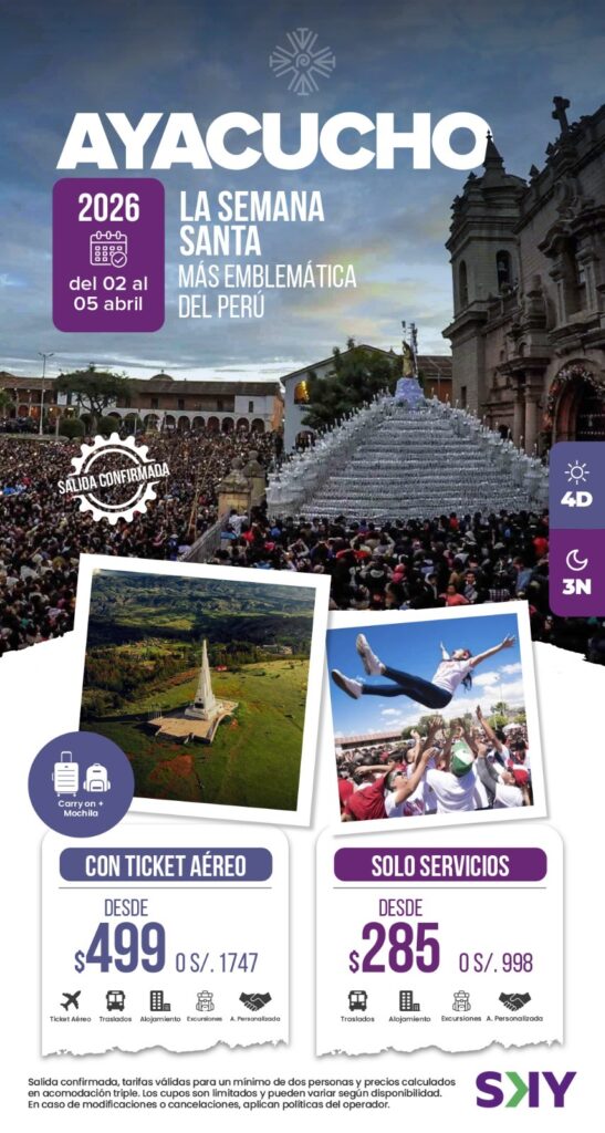Ayacucho: Conocida como la “Ciudad de las 33 Iglesias”, ofrece la experiencia de Semana Santa más auténtica y emocionante del país. Con salidas garantizadas, Perú Inkasico asegura un lugar en el epicentro de la fe nacional antes de que se agoten los cupos.