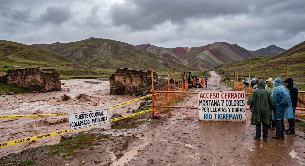 LLUVIAS GOLPEAN CUSCO: COLAPSA PUENTE COLONIAL EN PITUMARCA Y CIERRAN UN ACCESO A LA MONTAÑA DE SIETE COLORES